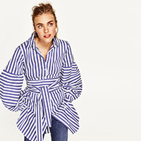 Trade in your traditional button down for this striped tunic that cinches at the waist with a tie belt and poufs out with voluminous sleeves.