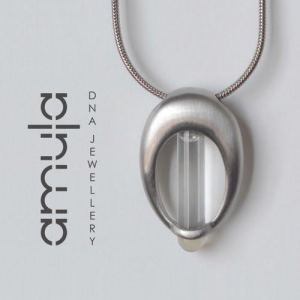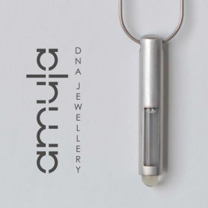 Available in three styles that nod to the future while reflecting timeless aesthetics, each Amula necklace features a pendant made of stainless steel holding a laboratory grade glass capsule containing a DNA sample suspended in water and glycerol. The glass capsule is sealed with a silicone cap and epoxy, then suspended from a stainless steel cable chain.
