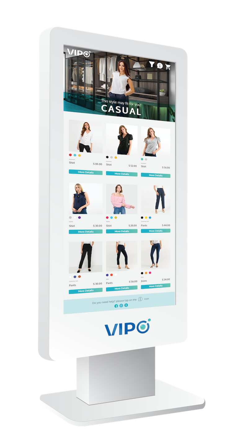 Hardware-wise, VIPO’s main component is a 49’’ LCD totem with a built-in web camera, which retailers can place in their point of sale: customers interact with the device by touching the screen and receive fashion advice based on their appearance and the in-store inventory.