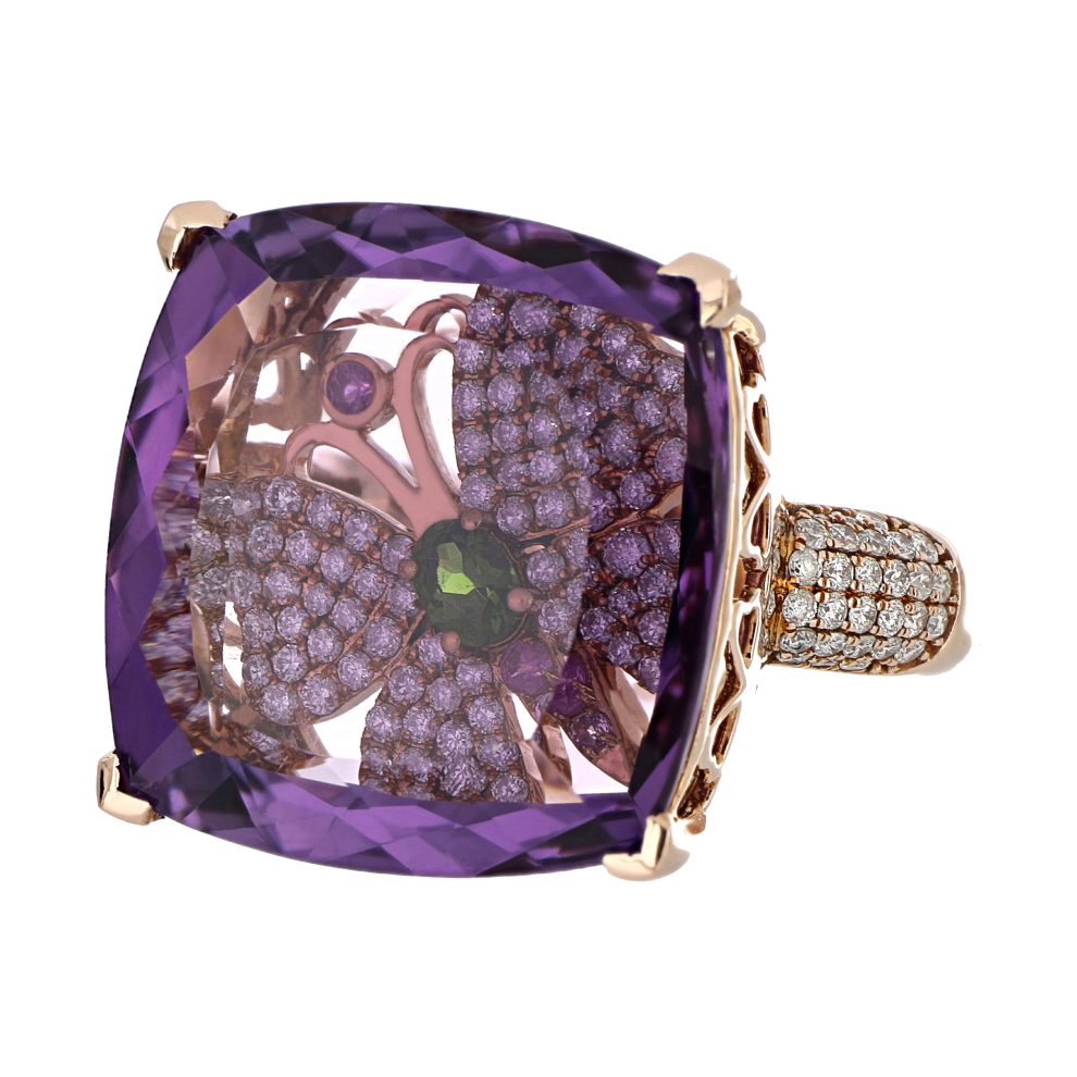 The Afterglow Amethyst and Secret Diamond Ring features a bed of white diamonds topped by a cushion cut purple amethyst, held in a split prong 14K rose gold setting. The profile of the band is engraved with French filigree detail, adding detail and depth. This piece emphasizes the strength of women with its split prong setting and sheltered bed of white diamonds. As a gemstone, amethysts are known for their calming energy and protective qualities. This ring is an homage to one’s inner calming energy, for peace, as well as to one’s inner warrior, for protection as needed. The Hexad Amethyst, Ruby and Secret Diamond Ring features an elongated hexagon cut purple amethyst above a layer of white diamonds and red rubies, haloed by a row of white diamonds set in a 14K rose gold tiger prong setting. The number six, as the sides of the hexagon, represent perfection, wisdom and love, specifically self-love for the wearer. The Monarch Amethyst and Secret Diamond Ring features a secret butterfly underneath, made with white diamonds, round amethysts and an oval cut chrome diopside, set below by a cushion cut purple amethyst, in a 14K rose gold setting, with pave white diamonds across the band. This piece demonstrates the transformative power each woman holds within, as well as her freedom. Like the ring’s namesake, each wearer is a queen, and the creator of her own destiny.