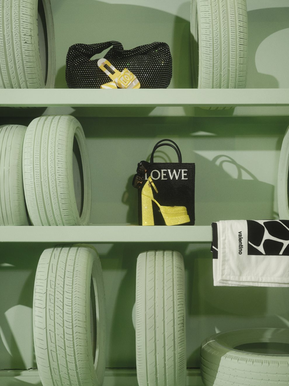 The unique space cannot be missed. Situated in a highly-trafficked area in East Hampton (directly across the road from the famous East Hampton railway station) the store will be splashed in the iconic, bold Mytheresa yellow and Flamingo Estate green. Leaning into the car theme and using it as inspiration across all the luxurious design elements, Mytheresa and Flamingo Estate will create the unexpected out of classic auto parts: shelves constructed out of tires, luxurious clothing presented on custom designed-car muffler rails, and tool shed housing luxury merchandised accessories and more.
