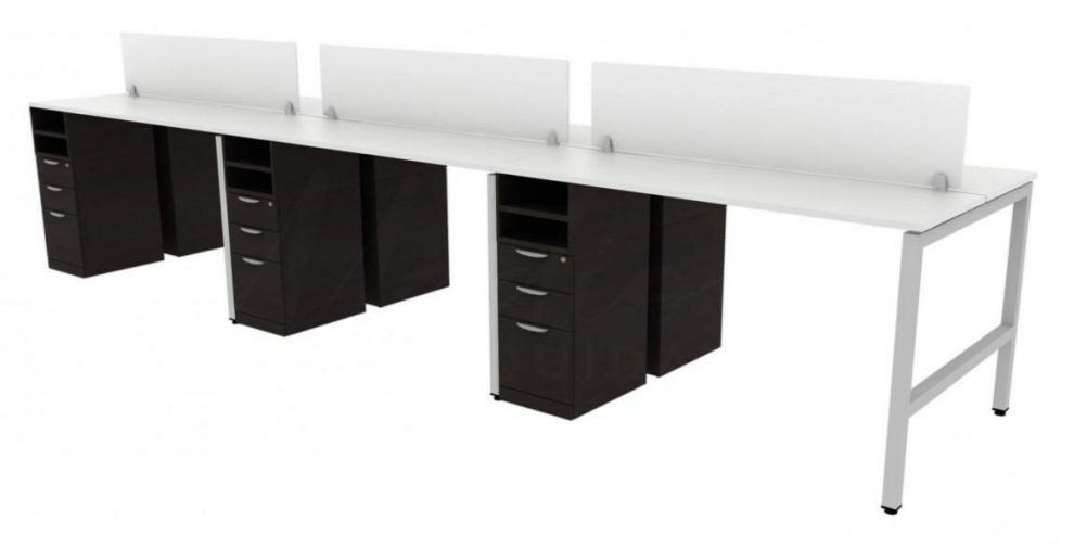 These multi-person standing workstations are the definitive answer for Madison Liquidators’ customers seeking to boost employee productivity while promoting a healthier, more engaging work environment. Designed to alleviate problems caused by modern office desks, this series features desks that allow users to stand while working or sit using a high office stool. Sturdy metal legs, scratch-resistant laminate tops, frosted privacy panels, and five finish colors also round out the features customers can expect. Adding modular pedestal drawers to the workstation allows clients to create a standing desk with drawers that can be kept clean and organized with ample space to put things away.