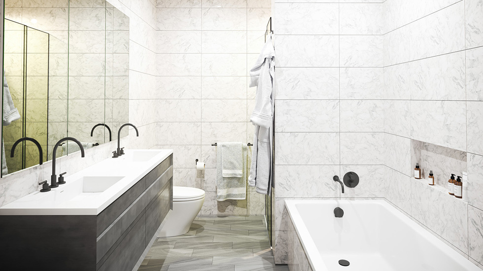 Providing residents with the ultimate privacy, each building has its own lobby, featuring polished dark concrete floors, Japanese charcoal wood walls, Italian tile, and a black steel chandelier. Interior designer Kimberly Peck, masterfully curated interiors that flow naturally from the building’s exterior and reflect Manhattan loft style finishes. The kitchens feature imported Italian Composit matte black cabinets with Bianco Puro white countertops, and top-line Sub Zero refrigerators, Bosch appliances, and wine fridges. The spa-like bathrooms include heated tiled floors, Dornbracht matte black hardware, Lacava floating vanities, mosaic marble tiled showers, frameless low iron glass doors, soaking tubs, and Toto toilets.