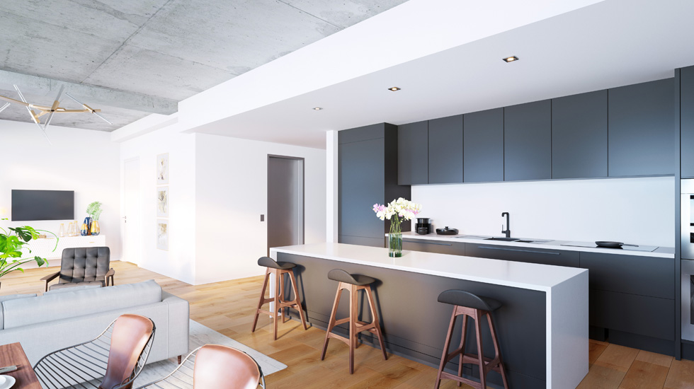 66 North Third features five full-floor residences, with direct key-lock elevator access to each of the grand three- and four-bedroom homes. Four of these loft-like units are approximately 2,000 square feet and have large, open kitchens, oversized islands, and outdoor space.