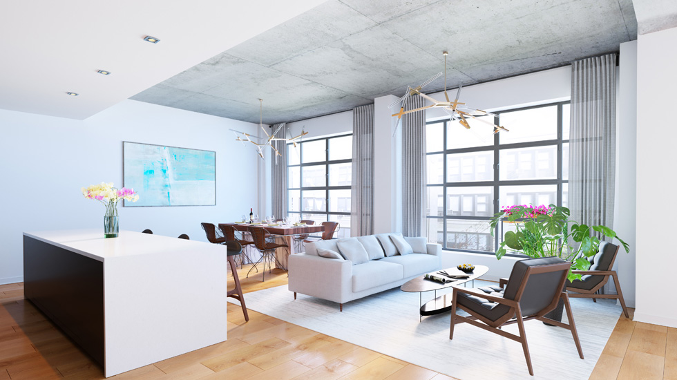 Creating the ideal home for families of any size, 62-66 North Third’s modern, smart, and sleek design elements will offer residents expansive living spaces, with high exposed concrete ceilings, oversized windows, outdoor space, tons of natural light, endless views, a virtual doorman, smart-home capabilities, private storage spaces, and bike parking.