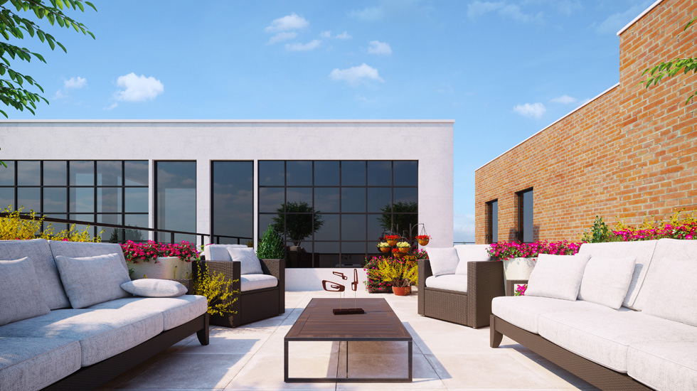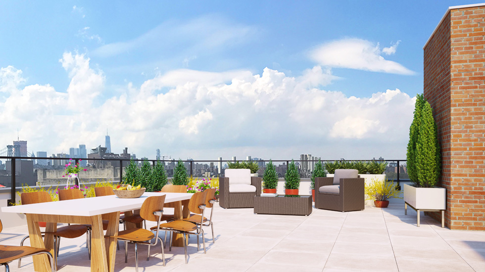 Each building offers a grand second floor home that boasts an open and airy 1,200-square-foot terrace, located right off of the kitchen and living room area, perfect for entertaining. Additionally, the development’s two three-bedroom penthouses, one in each building, boast an incredible amount of outdoor space spread over two levels. Each offers a terrace off of the living room with a bi-fold door, marrying the indoors and outdoors in one space. Residents can saunter up the interior stairs to a solarium that leads out to a private 1,100-square-foot roof deck, where the residents have the option of installing a shower, a barbecue, a bar, or a garden in the ample outdoor setting. The outdoor spaces have picturesque views of the Manhattan skyline and NYC iconic landmarks, including the Freedom Tower, the Williamsburg Bridge, the Empire State Building, the 59th Street Bridge, and the new Kosciuszko Bridge.