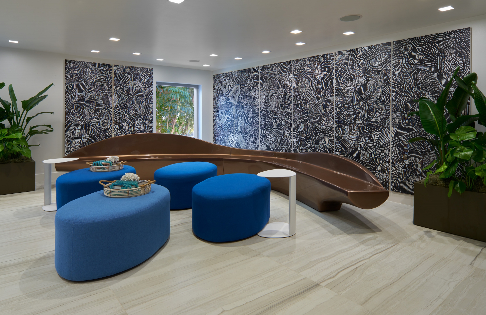 Hillsboro Beach Resort, the only resort along Hillsboro Mile, has featured artwork by award-winning, New York City-based contemporary artist and muralist, David Paul Kay. Upon entry, guests are faced with Kay’s collection of abstract sculptures within the hotel’s showstopping indoor/outdoor lobby space with breathtaking views of the private beach and sparkling Atlantic waters. Towering, rounded sculptures of female silhouettes covered in streaks of paint are scattered across the property. Kay’s distinct artistic style is monochromatic – mainly black and white – with vibrant lines and intricate details that tell a narrative. His global exhibitions and contributions have been featured in global campaigns for companies like Montblanc and Equinox.