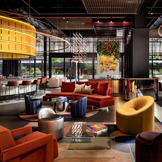 Designed by global creative agency Sid Lee, W Toronto is a juxtaposition of the city’s biophilia, man-made city grid and brutalist architecture. The contrast begins with the exterior, where the brutalist facade has been transformed through warm, LED lighting that illuminates the night sky, including a glowing, opaque orange lift to take guests to the rooftop bar and restaurant. The journey begins on the 6th Floor, where the Welcome Desk and Living Room (the W brand’s signature lobby/lounge) drips in jewel tones of ruby, amethyst, and topaz – with curved lines and velvet furniture reminiscent of Toronto’s late 60s and early 70s counterculture movement. Other highlights of the 5,000 square foot space include a communal “fire” pit, a circular destination bar featuring cascading amber lighting, and access to The Yard, an outdoor terrace surrounded by a three-story atrium of guest room windows – creating a voyeuristic tension between public and private.
