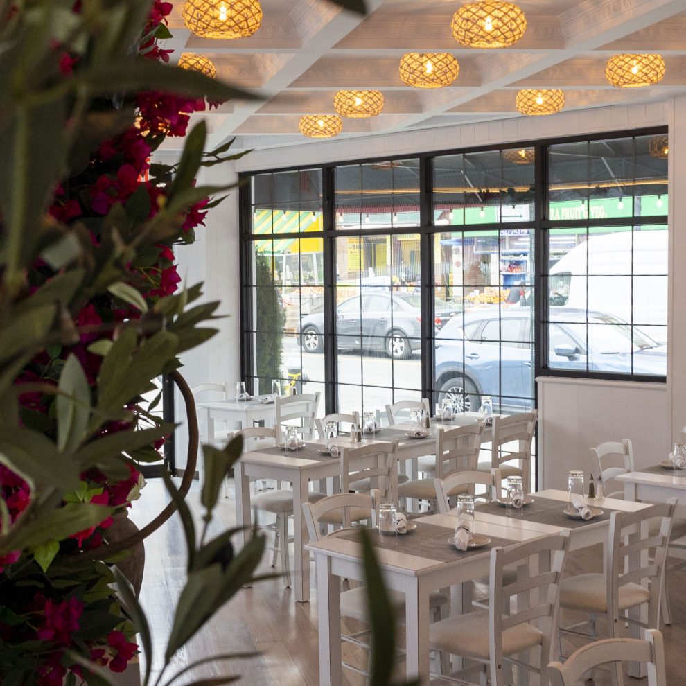 Nisí aims to replicate the breezy ambiance of a Greek island with whitewashed walls and authentic Greek artworks. You will feel transported to the beautiful, scenic islands looking over the Aegean Sea.