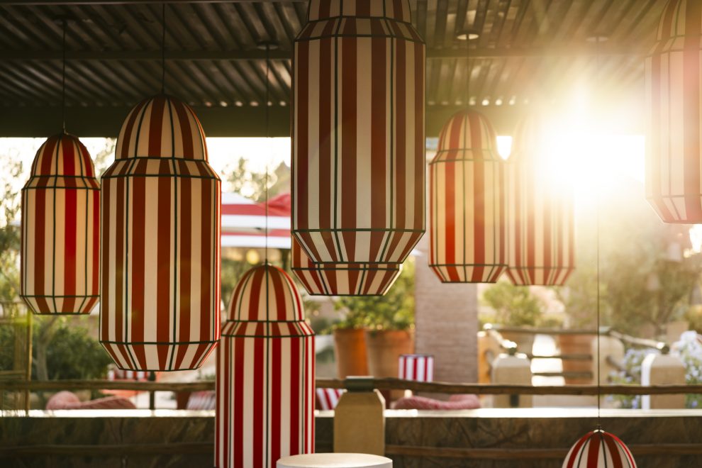 On the rooftop terrace, the hotel’s signature red-and-white stripes remain, now infused with a new energy. Monumental Moroccan lamps designed by Yann and made by local artisans, rendered in the same palette, are suspended like art installations, while bold prints and layers of vibrant textiles inspired by 1970s geometric, swirling lines bring a cinematic quality to the space. Local artisans, working with traditional zellige tilework techniques, have created striking new table designs that establish a fresh visual graphic identity for the restaurant. The atmosphere is abundant, with pattern, light and texture combining to create a rooftop that feels both timeless and newly alive.