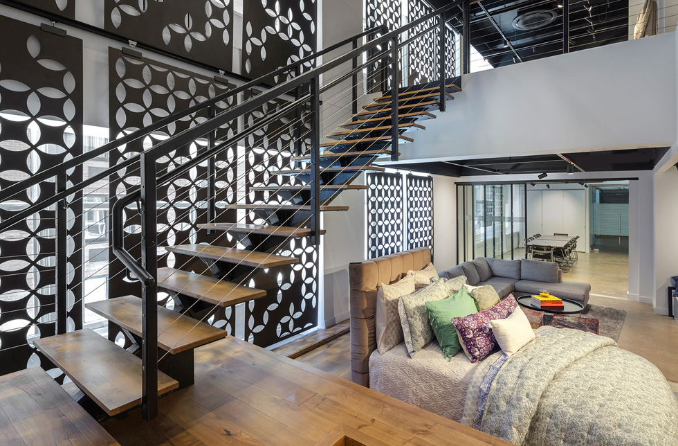 During the pre-design consultation, Pem executives expressed the desire for a dramatic space to both showcase frequently changing product collections and entertain customers during Home Fashion Products Association Market Week twice a year. “In response to these requirements, the architectural team developed a design that incorporates modern finishes and materials, extensive open spaces, and custom fixtures, explained MADGI project manager Ajay Waghmare, LEED AP. “These include the custom-designed, powered, movable wall panels, engineered by MADGI for flexibility and ease of reconfiguration.”
