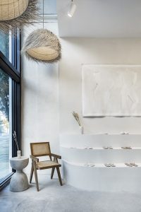 Designed by interior designer Montana Burnett, the new TKEES location incorporates interiors reflective of the brand’s minimal and pared-down ethos, using natural elements and textures throughout the space. TKEES collections are displayed in a non-traditional way, featuring a seated lounge inspired by the brand’s favorite boutique hotel stays.