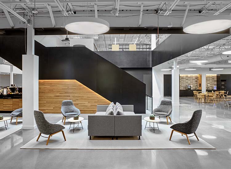 Some of the key tech features of the development include a Tech Bar and a Retail Lab to validate new in-store tech solutions in order to better manage retail and end users’ IT-related activities for the region. Designed by architecture firm HLW, the building’s interior blends elements of French style, simple materials and a neutral color palette to balance sophistication and warmth with the building’s industrial nature. Taking inspiration from Kering’s Paris office’s central courtyard, which anchors the flow of the workspace, HLW designed a 50-foot stadium staircase, which leads to a mezzanine level and cascades into the cafe, offering views out onto a nearby golf course though 24-foot-tall windows.