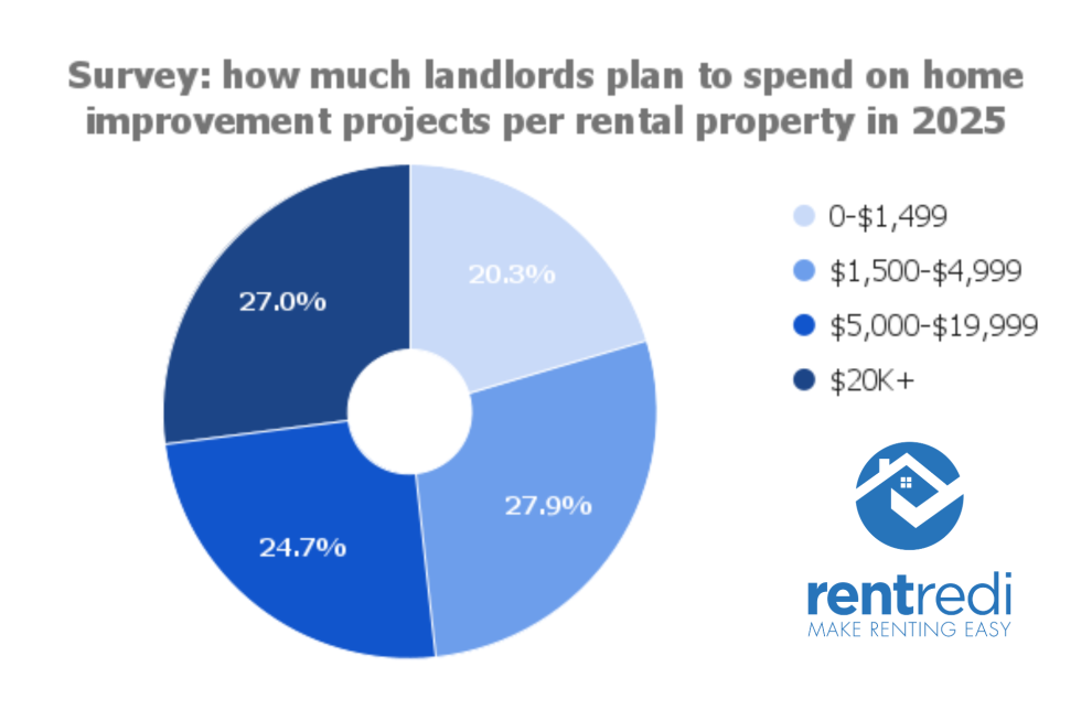An internal survey of 3,500 RentRedi landlords revealed that at least 80% of them plan to invest in home improvement projects for their rental properties in 2025. A little more than a quarter of respondents (28%) plan to invest in smaller projects costing between $1,500 and $4,999 per rental property. A quarter (25%) plan to spend between $5,000 and $19,999 per rental property. And a little more than a quarter of the landlords surveyed (27%) plan to invest in larger renovation projects, spending more than $20,000 per property in 2025.