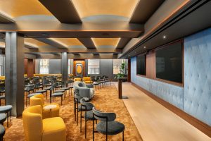 Second-floor hospitality suites named “Print & Press” feature a high-end fitness center with showers and lockers, a library with fireplace, expansive lounge space with open seating, a podcast room, golf simulator and grab-and-go food experience on the ground floor.