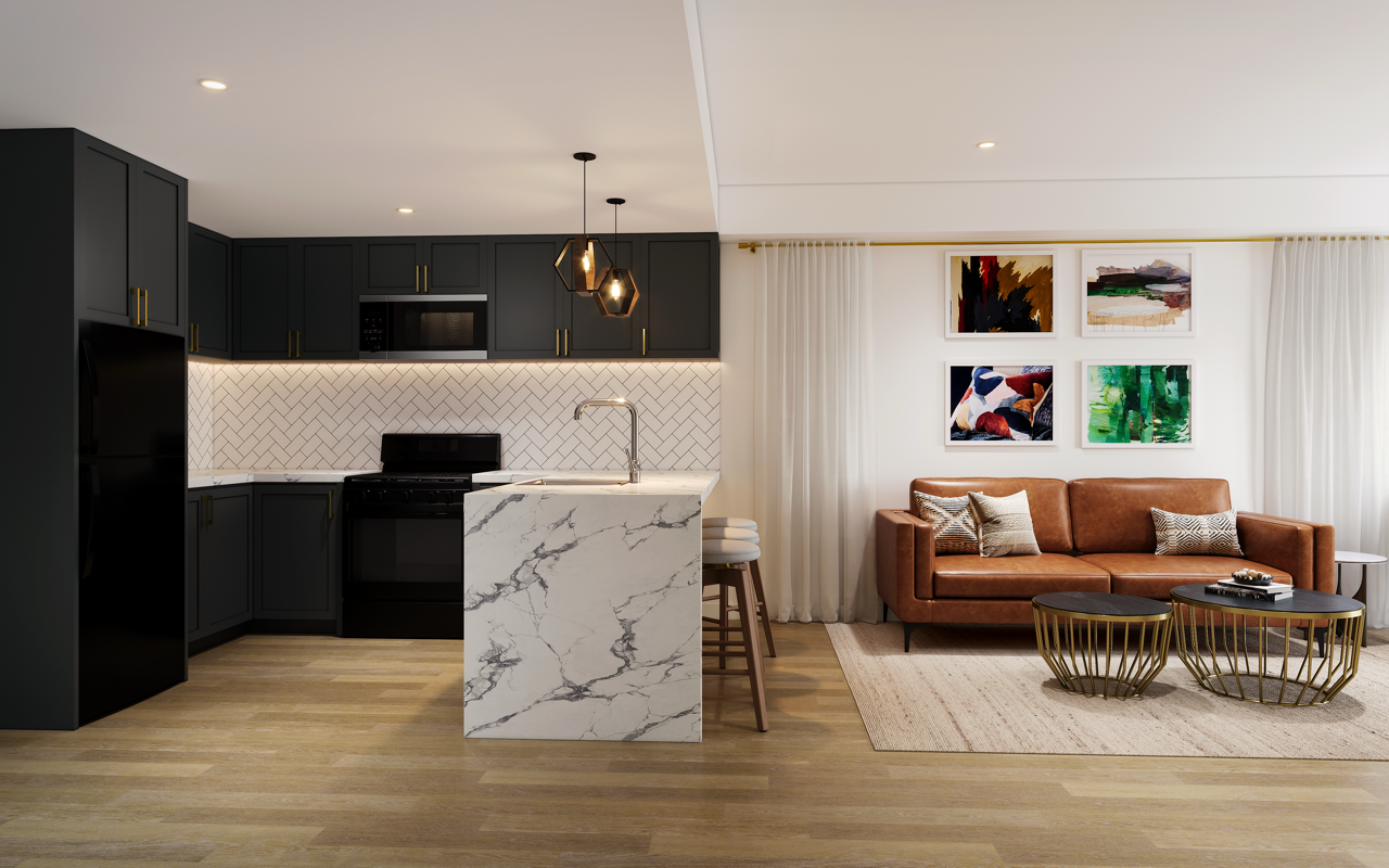 The Ethos Kelsey apartments feature modern interiors with detailed woodwork and breakfast bars. Many units also offer private terraces, blending indoor comfort with outdoor living. Designed with contemporary convenience in mind, each residence provides a stylish and functional retreat. They will range from 596 sq. ft. for studios to 996 sq. ft. one bedrooms. The monthly rent starts at $2,300.