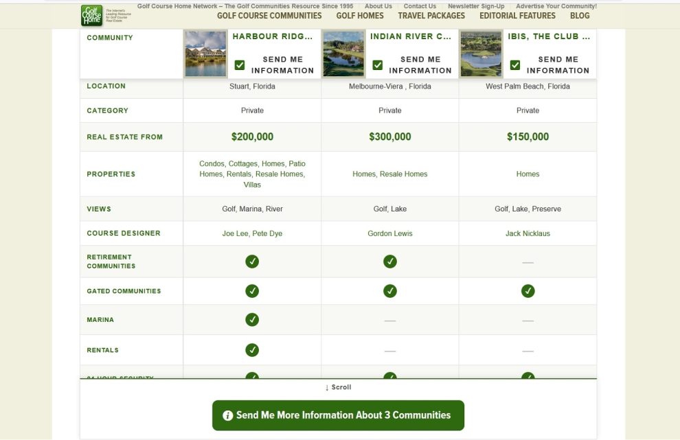 Buyers searching for their ideal golf course community can now compare location, pricing, amenities, golf course designer, real estate products and more of up to three golf communities at one time and submit an inquiry to all three with just one click. The new Compare function saves time — no more switching back and forth to survey various communities — and it allows a buyer to investigate and inquire about more communities in less time.