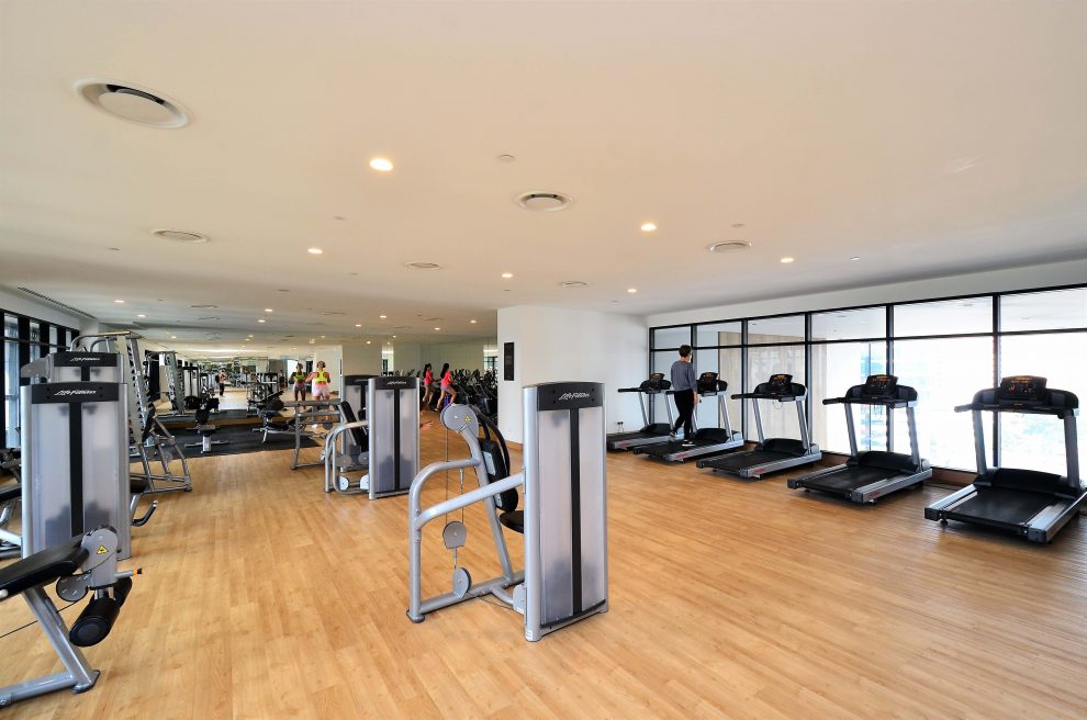 A recommendation for cardio equipment is to space them in an “X” pattern with people facing away from each other and erecting barriers in front to minimize the migration of aerosols into traffic areas.